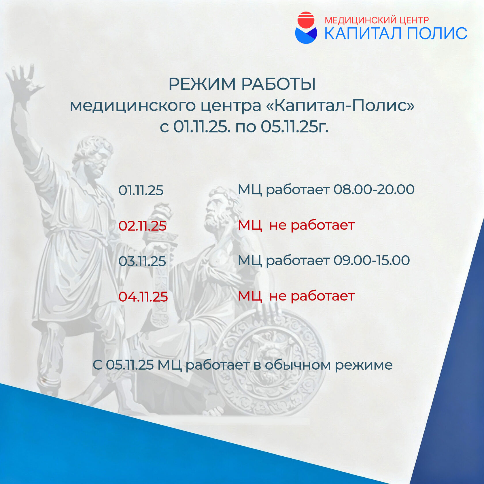 Режим работы медицинского центра «Капитал-Полис» с 1.11.25г. по 5.11.25г.